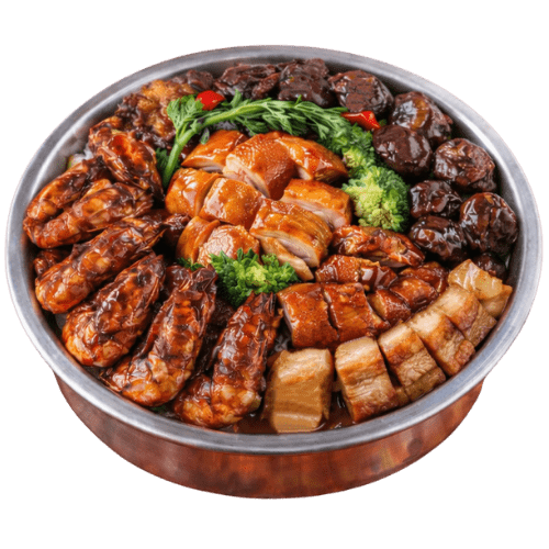 乾煎大蝦(6-8虎蝦) / 橫財就手 / 玫瑰豉油雞 / 秘制鹵水鴨 / 黃金魚蛋 / 紅炆花菇 / 爽脆魷魚 / 爽脆豬皮 / 家鄉炆豬肉 / 香甜蘿蔔 / 五香芋頭 / 南乳枝竹 / 清甜蓮藕